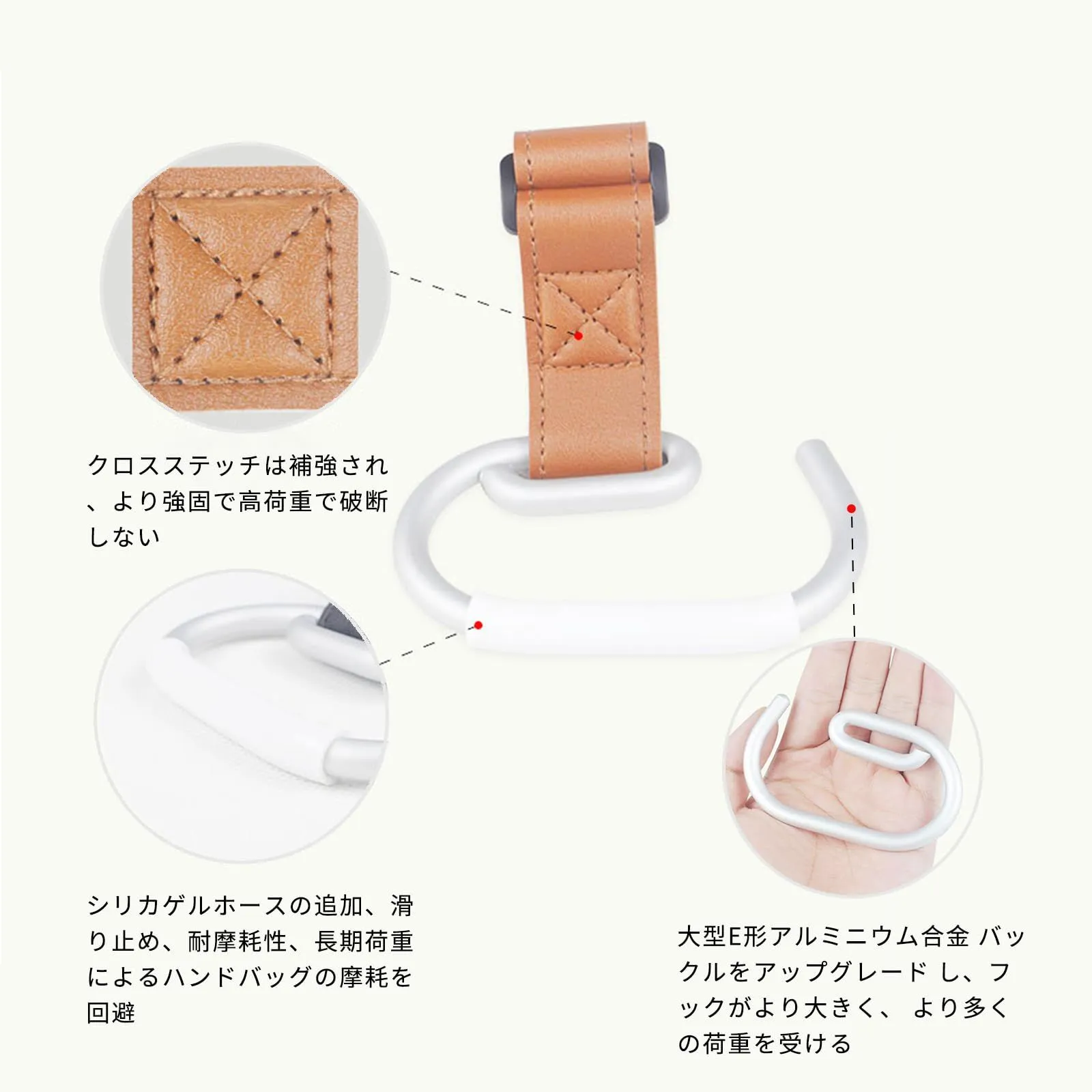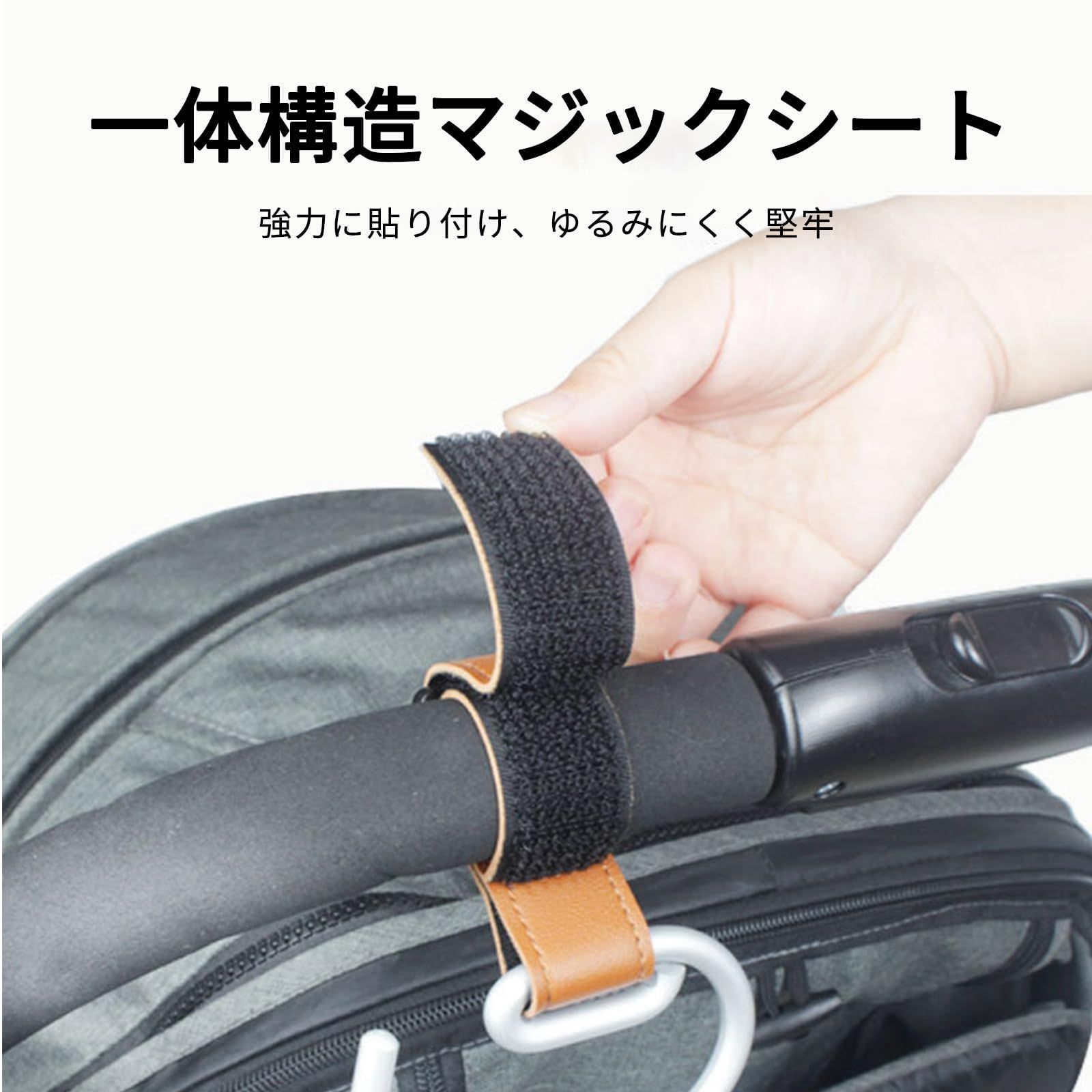 【手触りが良いPU製】ベビーカーフック本体がPUレザー製であることから、滑らかで手触りがいいです。カラビナはステンレス合金製で作られており、錆びにくく頑丈です。マジックテープはしっかりとした粘着力を持っているため、買い物袋などをしっかりと固定することができます。繰り返し使用可能で、何度も開け閉めしても劣化しにくいです。