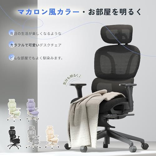 【オフィスチェアC7 Lite・仕様】サイズ:幅60.5cm奥行66m高さ106.5118cm(座面高さ4450.5cm) カラー:バニラホワイト、アボカドグリーン、ココナッツグレー、ラベンダーパープル、ノワールブラック ロッキング角度:121度 張地素材:メッシュ 耐荷重:136kg 重量:16kg 保証年数:3年