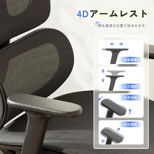 【4Dアームレスト・2Dヘッドレスト】4Dアームレストは上下・前後・左右・水平回転の調節でき、腕を最適な位置で休ませます。2Dヘッドレストは高さと角度を快適なポジションに調節が可能。どんなシチュエーションでも、自分に合った最適な姿勢で座ることができます。