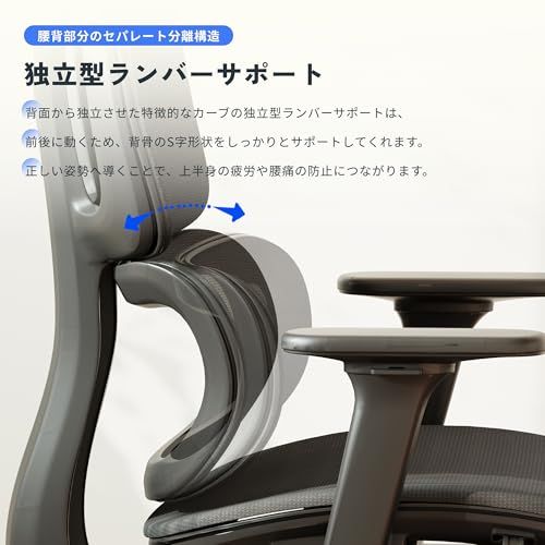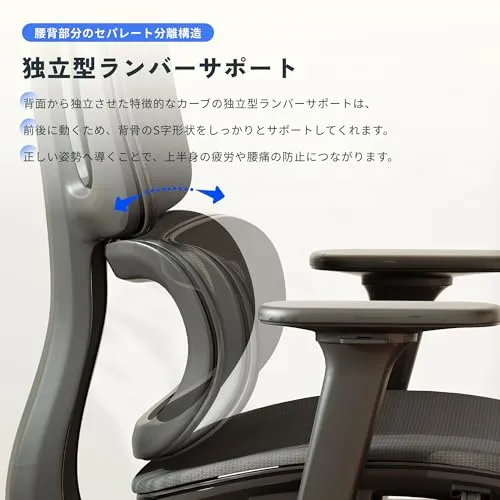 【独立型ランバーサポート】背面から独立させた特徴的なカーブの独立型ランバーサポートは、前後に動くため、背骨のS字形状をしっかりとサポートしてくれます。正しい姿勢へ導くことで、上半身の疲労や腰痛の防止につながります。