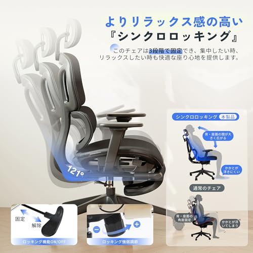 【シンクロロッキング・オットマン内蔵】背もたれは121度までリクライニング可能で、体を思いっきり伸ばせます。このチェアは3段階で固定でき、集中したい時、リラックスしたい時も快適な座り心地を提供します。デスク作業の時は収納、休憩するときにはリクライニングを倒し、オットマンに脚を乗せてリラックスタイムを過ごすことができます。