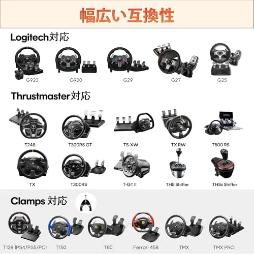 【広範な互換性】DIWANGUSのユニバーサルレーシングホイールスタンドは、Logitech(G923、G920、G29、G27、G25)やThrustmaster(T300RS GT、T300RS、T300 Ferrari、TX、T-GT、TS-PC、TS-XW、T150、T80、T248、T248X、Ferrari 458、TMX、TMX PRO)に対応し、PS5、PS4、Xbox 360、Xbox One、PCで使用できます。※ステアリングホイール、ゲームペダル、トランスミッションは含まれていません。