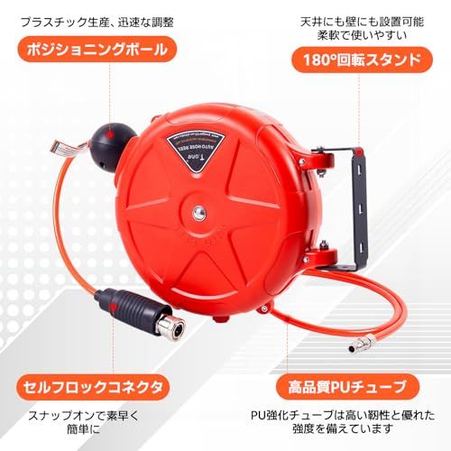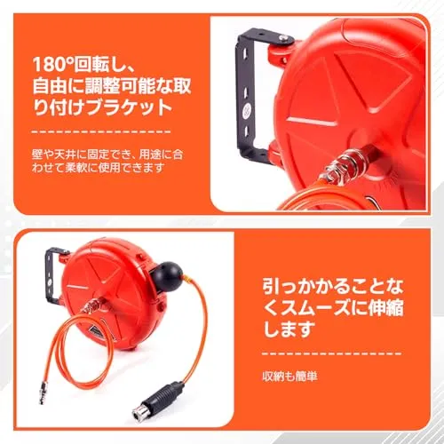 エアーホースリール 自動巻取式 10m 自動巻き上げ ブラケット付 壁掛け 天吊り 持ち運び使える エアホース 空気圧工具 オート引き込み式 エアホースホルダー オート180°回転可能 屋外用8mm*10m★tm