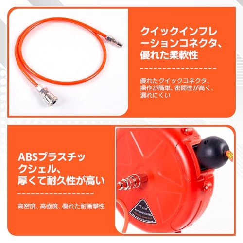 【自動巻き戻し】自動巻き戻し式エアホースリールは、セルフロック機構を備えた自動巻き戻し設計が特徴で、ホースを簡単に巻き戻すことができ、ホースがきちんと整頓され、巻き取りや結び目が減り、使いやすいです。