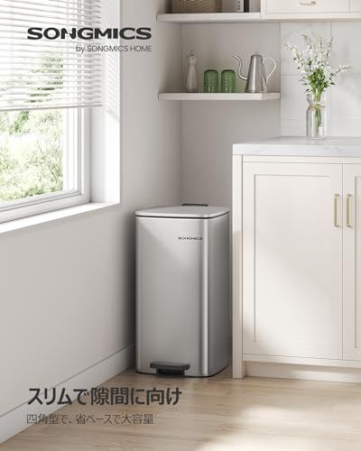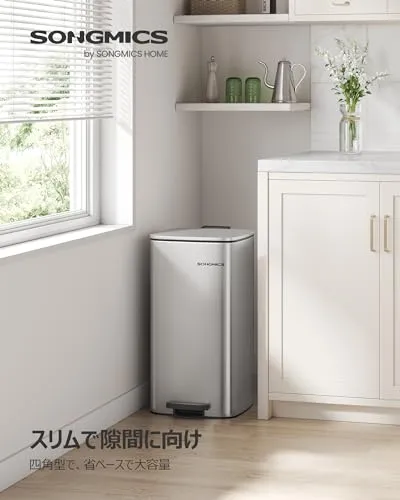 SONGMICS ゴミ箱 スリム 30L ペダル式 蓋付き ステンレス製ダストボックス キッチン、リビング、洗面所隙間用 大容量 音が静か 袋が見えない 省ペース 防水 内バケツ有り おしゃれ シルバー LTB593E01★tm