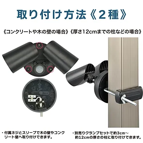 【 特 長 】 明るさ強力2000ルーメン 雨に濡れる場所で使用できます 点灯開始照度・点灯時間の調整ダイヤル付き 家庭用100V電源タイプ 赤外線センサーで人を検知しライトが点灯 光源は白色LEDを24個使用 ライトの首が動き、お好みの位置を照らすことができます 弊社別売クランプセット(品番:07-8285/型番:OSE-SCS1D)で 柱に取付可能