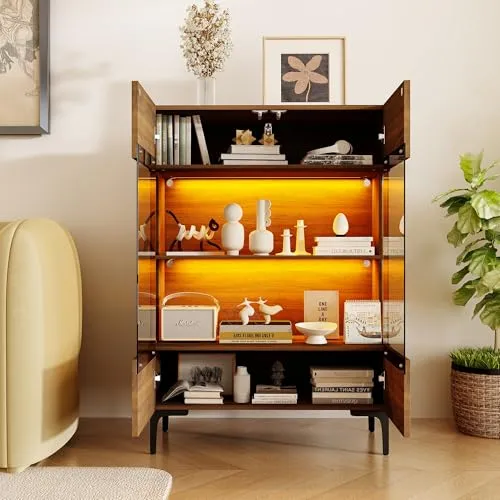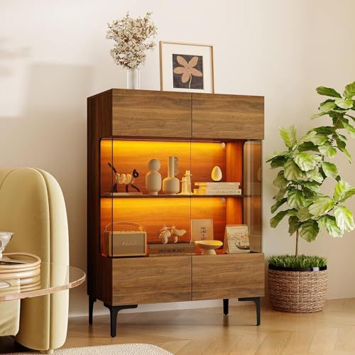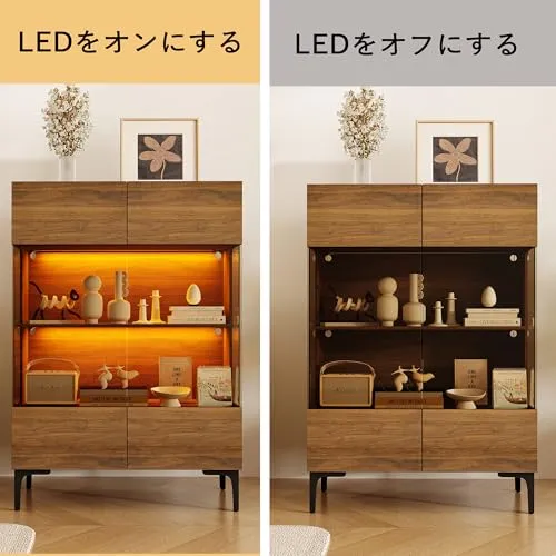 FUFU&GAGA コレクションシェルフ 幅80cm ガラスケース サイドボード コンパクト ライト付き 木製 北欧 ディスプレイラック おしゃれ 扉付き リビング収納 (ブラウン)/