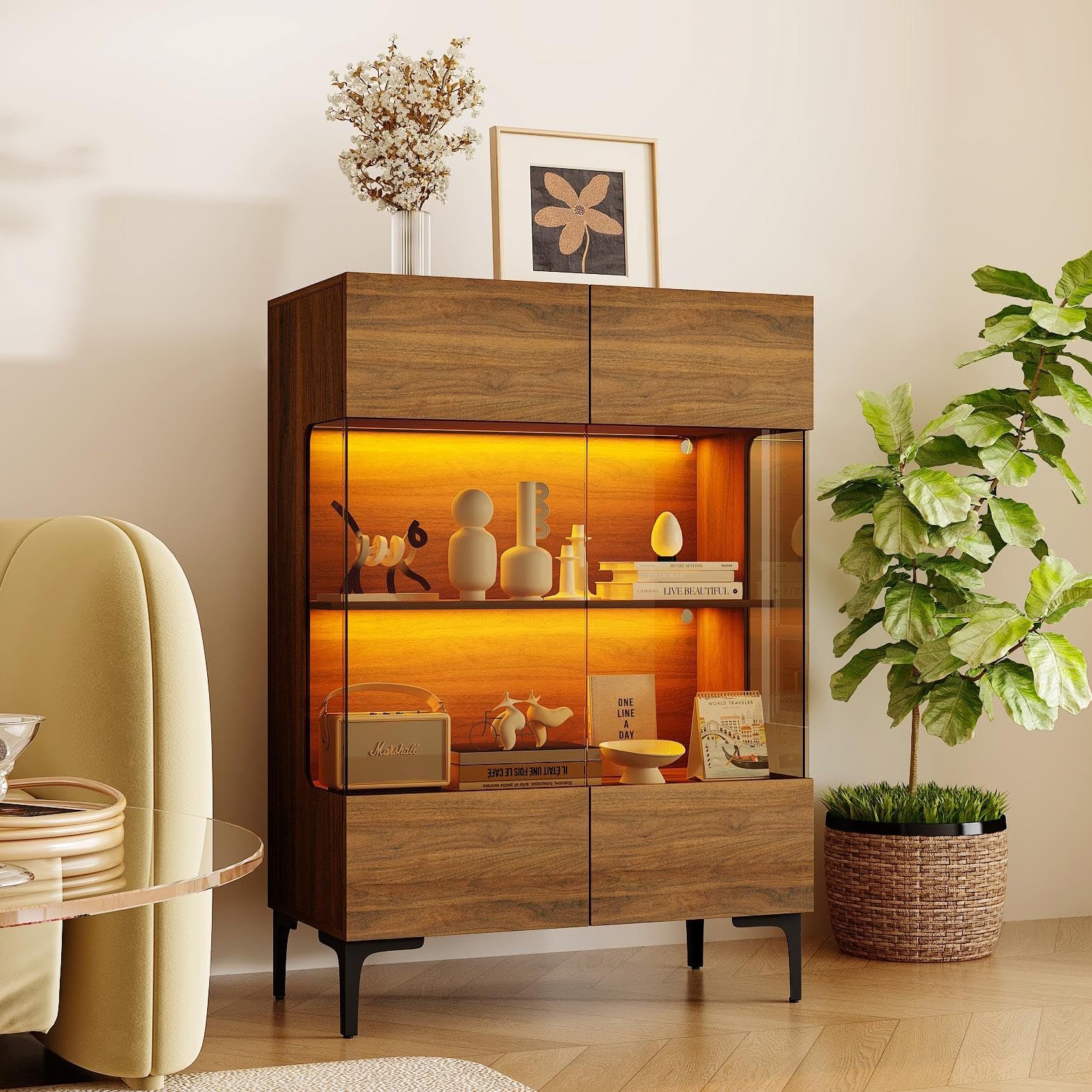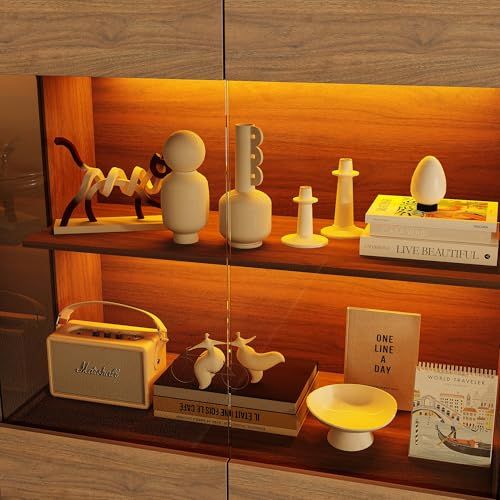 【暖色LEDライトで雰囲気のあるディスプレイ空間を演出】 内部に暖色LEDライトを搭載し、棚全体に柔らかな光が広がります。飾った雑貨やオブジェがより立体的に見え、リビングや寝室に落ち着いた雰囲気をプラスします。夜間の間接照明としても使える実用的なライトです。