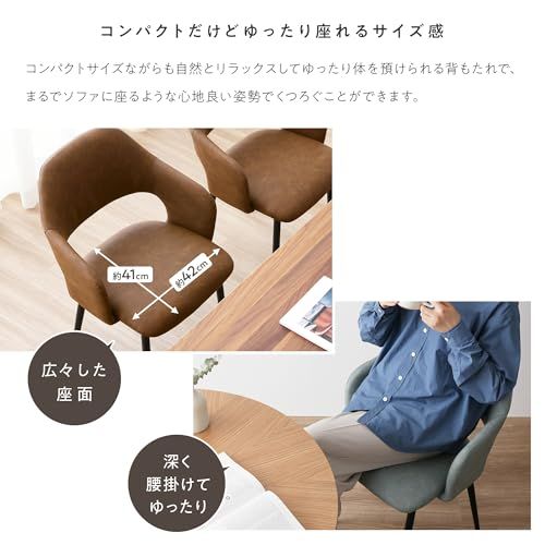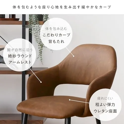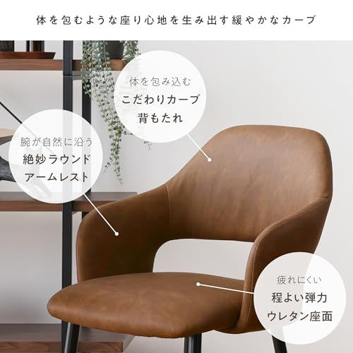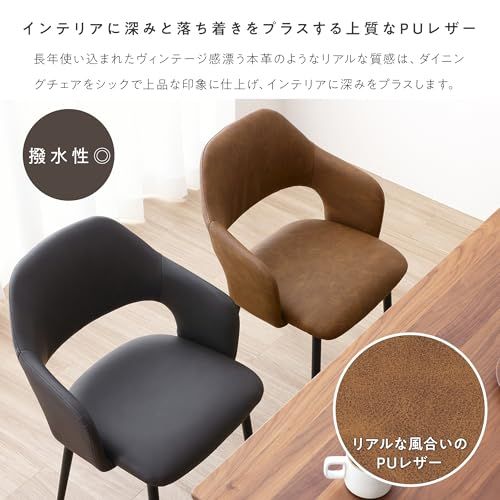 【インテリアに深みと落ち着きをプラスする上質なPUレザー】座面と背面には、味わい深い風合いを生むエイジング加工が施されたPUレザーを使用。長年使い込まれたヴィンテージ感漂う本革のようなリアルな質感は、ダイニングチェアをシックで上品な印象に仕上げ、インテリアに深みをプラスします。しっとりと滑らかな手触りで触り心地も撥水性にも優れているので、食べ物や飲み物をこぼしてしまってもサッと拭き取ることができ、ダイニングでも安心してお使いいただけます。