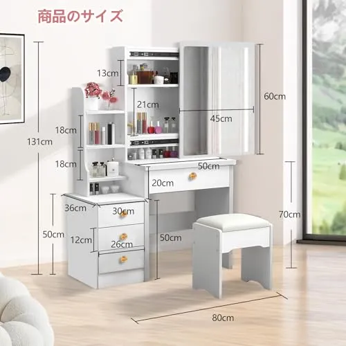 【商品サイズ】ドレッサー本体:幅80cm 奥行36cm 高さ131cm スツール:幅32.5cm 奥行22cm 高さ40cm。狭い寝室や一人暮らしの小さいお部屋、ちょとした隙間でも圧迫感なくすっきり収まります
