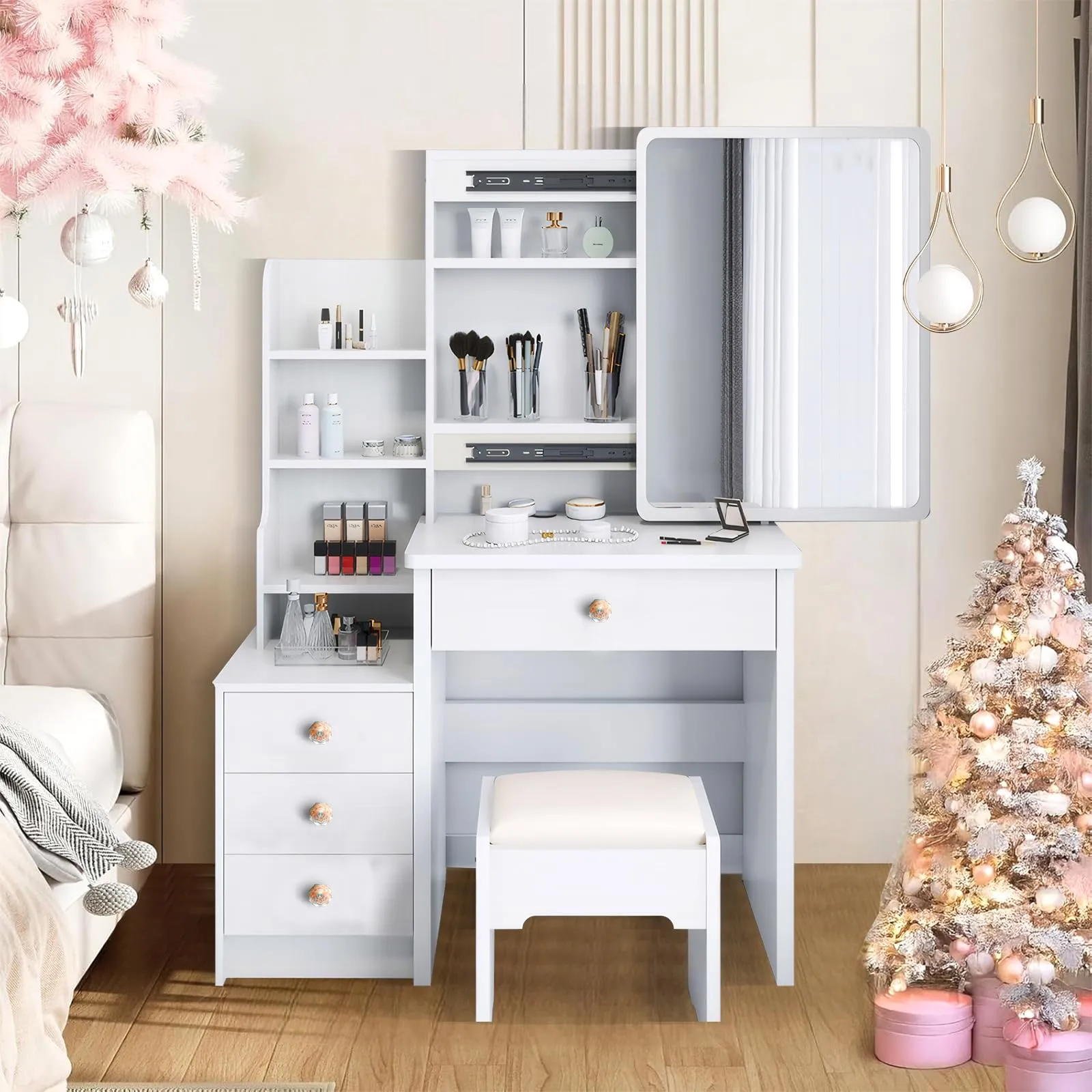 ドレッサー 化粧台 コンパクト ホワイト スツール付き 鏡台 大容量収納 4段引き出し メイク台 (ホワイト)/