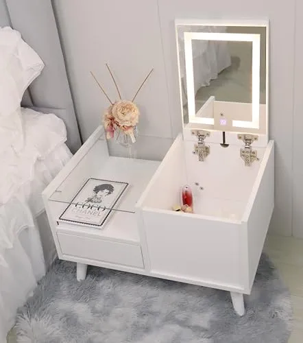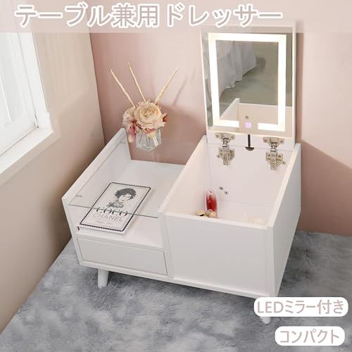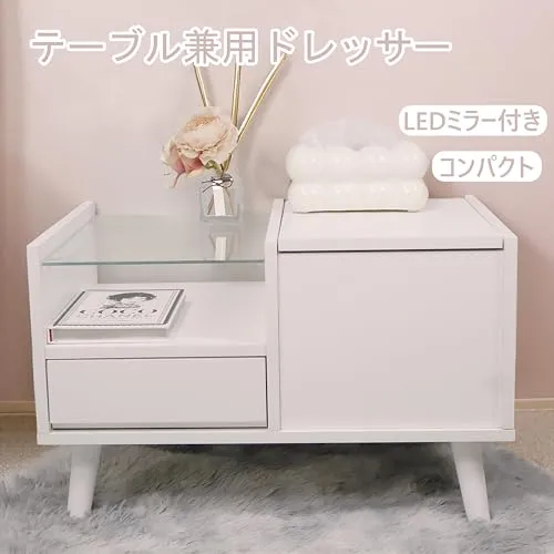 ドレッサーテーブル 引き出し 収納棚付き LEDミラー付き 強化ガラス リビングテーブル 木製 大容量収納 多機能 組み立て簡単 幅60CM ホワイト/