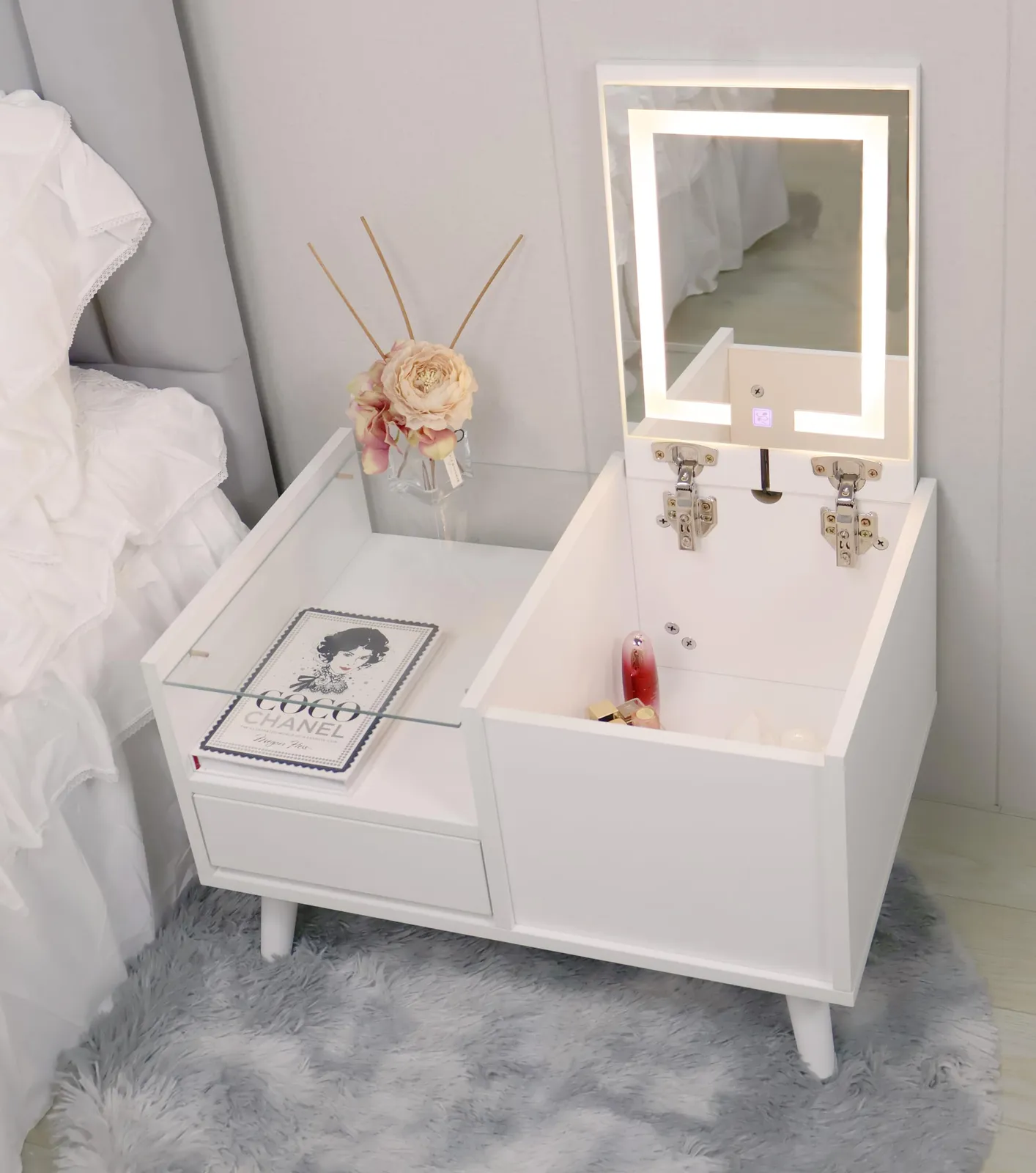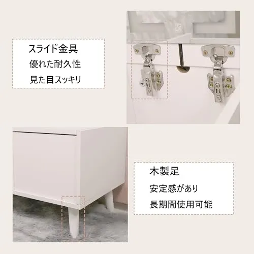 【デザイン】天板を開ければドレッサーに早変わり、顏全体がしっかり映る大きな鏡と、大小さまさま なコスメグッズ対応した豊富な??が?日のおでかけ準備をサポートたします。