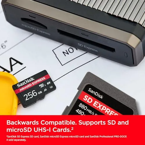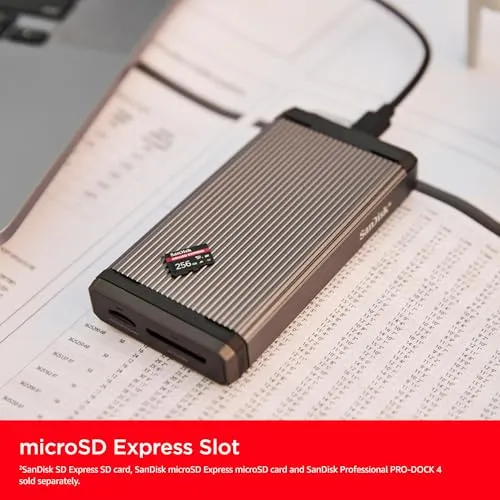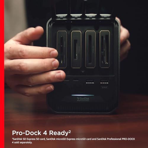 PRO-DOCK 4 READY。 SanDisk Professional PRO-DOCK 4と互換性があり、オフロード、編集、アーカイブを同時に行えます。 ** (SanDisk SD Express SDカード、SanDisk microSD Expressカード、SanDisk Professional PRO-DOCK 4は別売りです)。