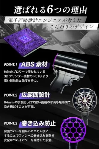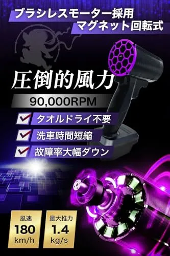 【マグネット回転式ブラシレスモーター 】風速180 km/h 、高速回転数90,000RPMの強力ターボファン!マグネット回転式を採用したことで寿命大幅UPと故障率大幅ダウンを実現しました。
