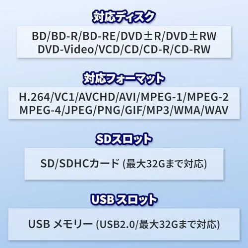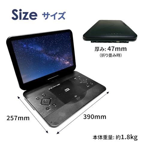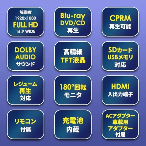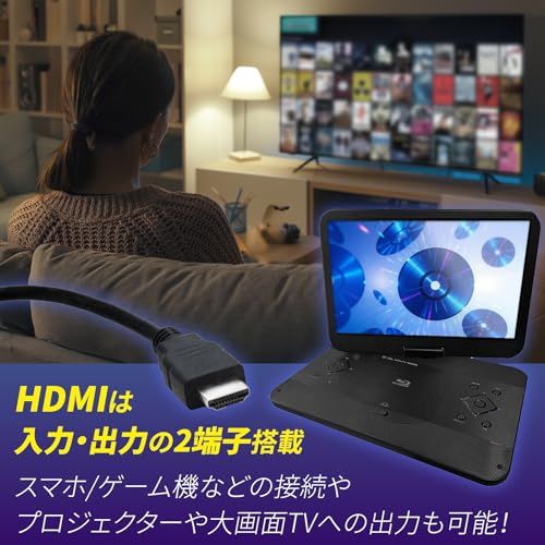 【対応ディスク】BD・DVD・CDに加え、BD-R/BD-RE、DVDR/RW、DVD-Video、VCD、CD-R/RWも再生可能。さらにSDカード(最大32G)・USBメモリー2.0対応.最大32Gまで対応。動画/音楽/写真の再生ができ、車内やアウトドアでも活用できます 156PB ポータブルブルーレイプレーヤー 15.6インチ 大画面モデル:ブルーレイ / DVD / CD をこれ一台で再生可能。19201080の高精細TFT液晶で、ブルーレイ映像を美しく再現。大画面ポータブルDVDプレーヤーをお探しの方に最適です HDMI出力でテレビやモニターに接続して大画面で視聴可能。さらにHDMI入力にも対応しているため、ノートPCやゲーム機の外部モニターとしても使用できます。充電時間:約4時間。再生時間:約2時間となります。 車載用アダプター付属・持ち運び可能:内蔵バッテリーは最大約2時間の再生が可能。ACアダプターに加え車載用DCアダプターも付属し、ドライブ中の映画鑑賞にもおすすめです リジューム機能&首振り対応:前回停止した位置から再生を再開できるリジューム機能を搭載。画面は180度回転/90度反転に対応し、見やすい角度で視聴できます