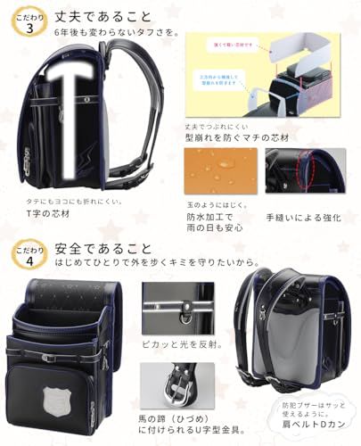 【基本構造から強いランドセルに。】型崩れ防止強化加工。教科書を入れる大マチと呼ばれる部分に、形状補正樹脂を、その中央部分に鉄芯を内蔵し、型崩れや折れからランドセルを守ります。