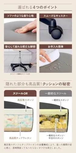 【商品説明】 コストパフォーマンスの高さで人気のスツールOR。そのシリンダーを長くすることで、最大63.5cmまで座面を上げられるようにしたロングバージョンです。 エステサロン・美容室などに限らず、どんな業態でもご利用いただけます。 ガス昇降式なのでレバー操作で簡単に高さを調節可能。約45.5-63.5cmまで調節できます。 座面は柔らかく座りごこちのよいウレタンスポンジを採用。長時間の施術にも対応します。また、キャスター付きなので座ったままの移動も可能です。キャスターやシリンダーは外れにくく安全性にも考慮しました。 レバーが使いやすい!楕円形で指形の溝が指にフィットします!座面近くに設置したため最小限の動作でレバーを見つけやすく軽いタッチで調節できます。