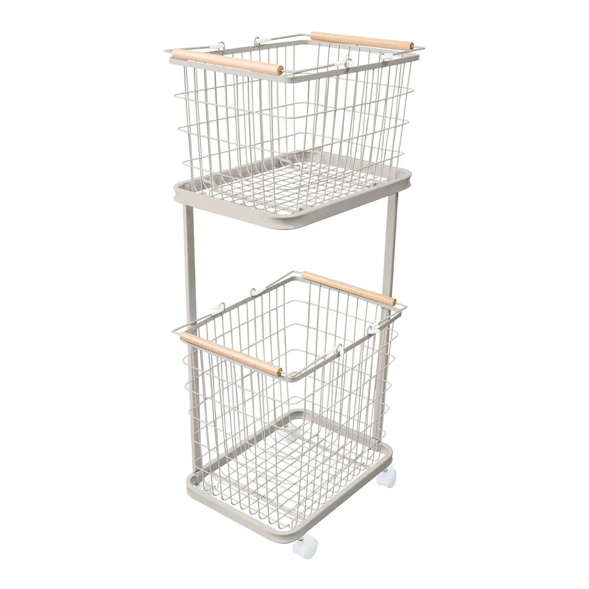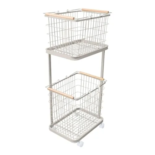 WEIMALL ランドリーバスケット 2段 大容量 67L ランドリーワゴン 洗濯かご スリム キャスター付き おしゃれ 天然木取っ手付き ランドリー収納 浴室 洗面所 収納 (カバーなし・アースグレー)FAE007GYE