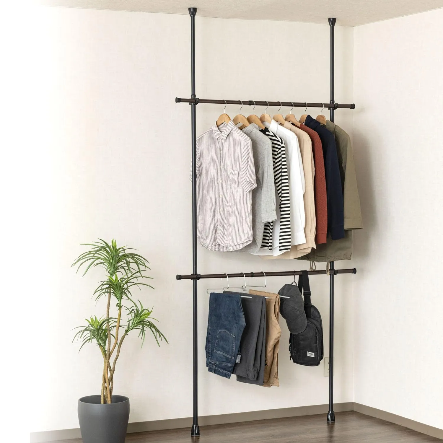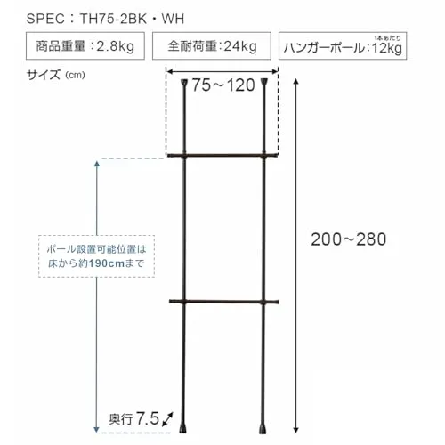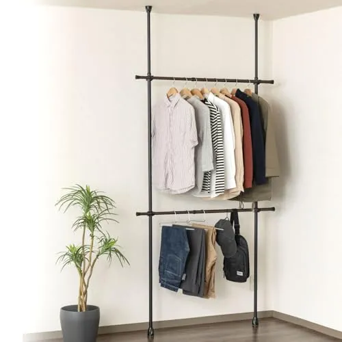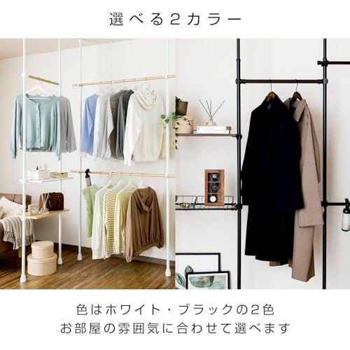 ドウシシャ 省スペースに設置可能な突っ張りハンガーラック 2段式 ブラック 夏服約48着収納可能 縦横伸縮可能 簡単組立 突っ張りラック スリム スチール 伸縮 おしゃれ 全体耐荷重24kg 幅75~120×奥行7.5×高さ200~280cm 黒 省スペース