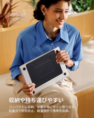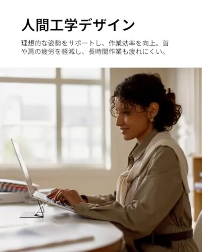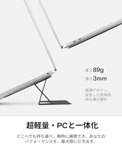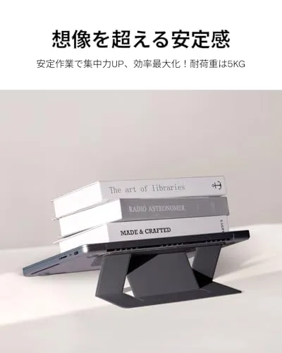 【厳選素材・重さに耐久】特製したポレウリタンとファイバーグラス素材と巧みな折り畳みデザインと組み合わせ、超軽量・超薄型で高強度・高安定性を実現します。耐荷重は最大5kg、作業時の安定・安全な支えを提供いたします。*ご注意:パソコンスタンドをご使用の際、キーボードの周りを叩くとパソコンが揺れるという意見を頂きました。この件について、実際に使用した場合を検討し、作業時両手を自然にキーボード上に置くと揺れることはないのでご安心ください。