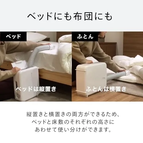 【エアマットいらずの、さしこむだけでふとん乾燥】エアマットレスタイプなのでホースをふとんにさしこむだけ。縦置きと横置きの両方ができるため、ベッドと床敷のそれぞれの高さにあわせて使い分けができます。