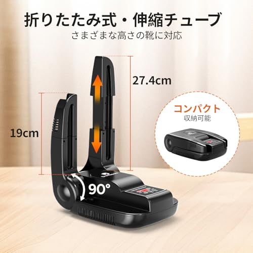 【3段階折り畳み式】簡単に収納できるや持ち運びに便利のために、このくつ乾燥機は90度の簡単に折りたたむ/繰り広げるのようなデザインを採用されました。2本の伸縮式のチューブは、完全に伸ばした状態で27cmの長さで、長いブーツでも全体的な脱臭と乾燥を実現します。完全に折りした状態で9cmの大きさで、下駄箱に収納するのが容易いです。
