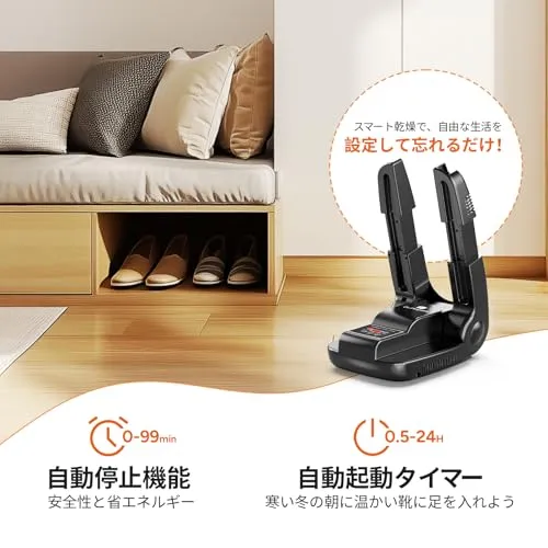 【タイマー機能付き】乾燥機はタイマー(最大99分)という設定があるので、靴の種類や濡れているの程度に基づいて靴の乾燥時間を決定できます、 さらに、予約機能のアクティベーションタイマー(0.5~24時間)を使用すると、乾燥機の稼働を開始するタイミングを確認し、湿った靴を予約時間の通りに乾いて快適な状態に戻すことができます。