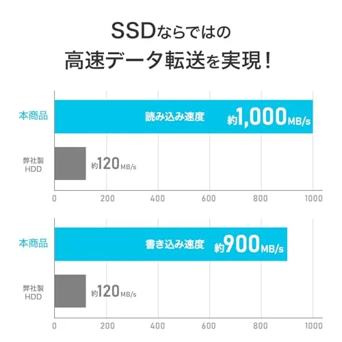 【SSDならではの高速データ転送を実現!】最大転送速度は、読み込み約1,000MB/s、書き込み約900MB/sで、高速なデータ転送を実現しました。大容量の動画や写真データも快適に扱えます。