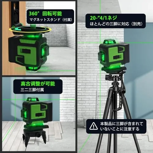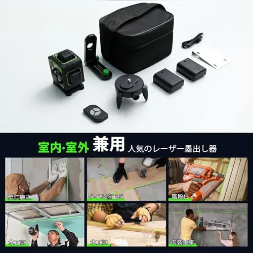 レーザー墨出し器、墨出しレーザー、4Dグリーンレーザー墨出し器、4x360°、水平器 レーザー ビルドとアライメント用、充電式バッテリー、リモコン、磁気回転スタンド レーザー安全基準:クラス2 16ライン レーザーレベル