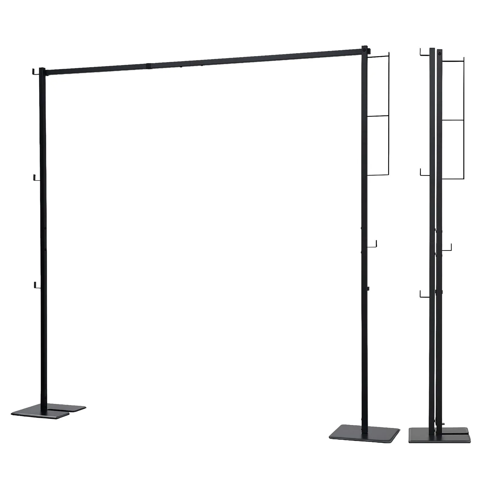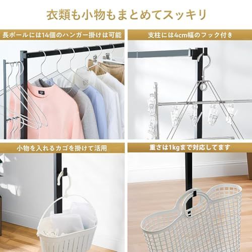 【物を掛けられる数】横幅150cmのハンガーポールには、ハンガーを1420個掛けることができます。側面には4cm幅のフックが4か所、9cm幅のフックが3か所ありますので、掛けたい小物を気軽に掛けたり、ハンガー付きの小物入れを掛けて、その中に洗濯ピンチや洗濯ネットを入れたり、または日常のラックスタンドとして、帽子やマフラー、洋服掛けなどちょっとした小物収納として役立てていただけます。安定感・耐久性・使いやすさを兼ね備えた物干しハンガーラックです。