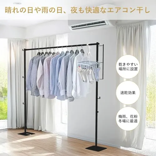 【広げても畳んでも使える物干し】通常の物干しは洗濯物を干し終えたら、折り畳んで収納してそのままですけど、この物干しは折り畳んだ後も、小物掛けラック、ハンガーラックとしてお使いいただけます。ですので使い方は様々で、広げて洗濯物干し用、乾いた後の洋服掛け用、畳んで小物掛け用としてご利用いただけます。また洗濯物を干す場合は、場所を移動して、窓の近くやベランダの近くで干したり、エアコンの近くに置いたりと、天候や、季節に応じて置く場所を変えていただくこともできます。