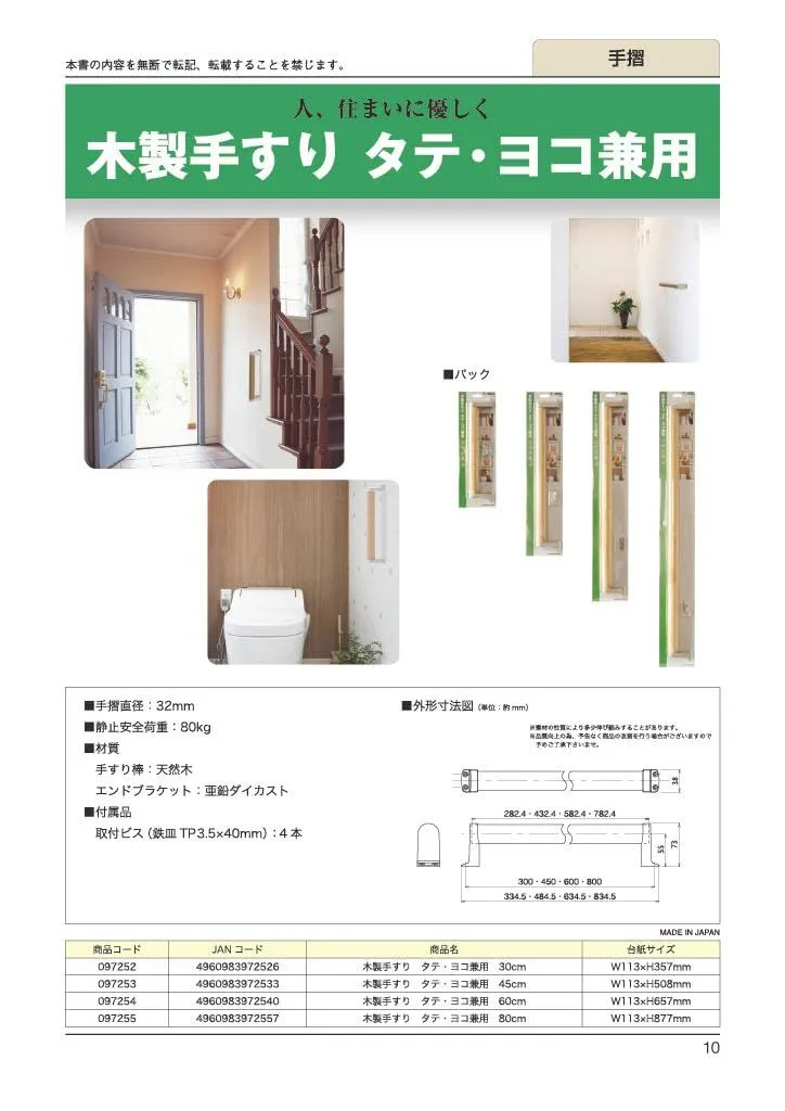 TQOOL 安全・安心 ハイロジック 屋内用 木製手すり タテ・ヨコ兼用 300mm 32パイ 耐荷重:80Kg 97252
