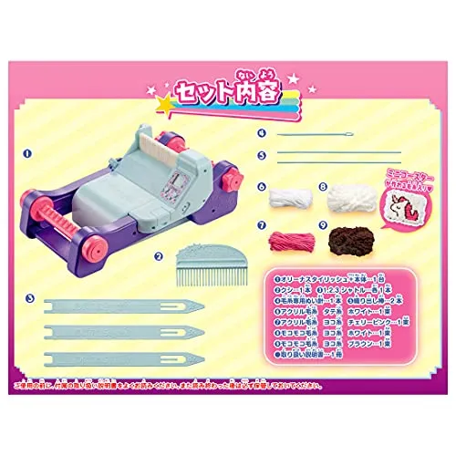 付属品:オリーナスタイリッシュ本体(1),クシ(1),シャトル(3),毛糸専用ぬい針(1),織り出し棒(2),毛糸 タテ糸 ホワイト(1),毛糸 ヨコ糸 チェリーピンク(1),モコモコ毛糸 ヨコ糸 ホワイト(1),モコモコ毛糸 ヨコ糸 ブラウン(1),取り扱い説明書(1)