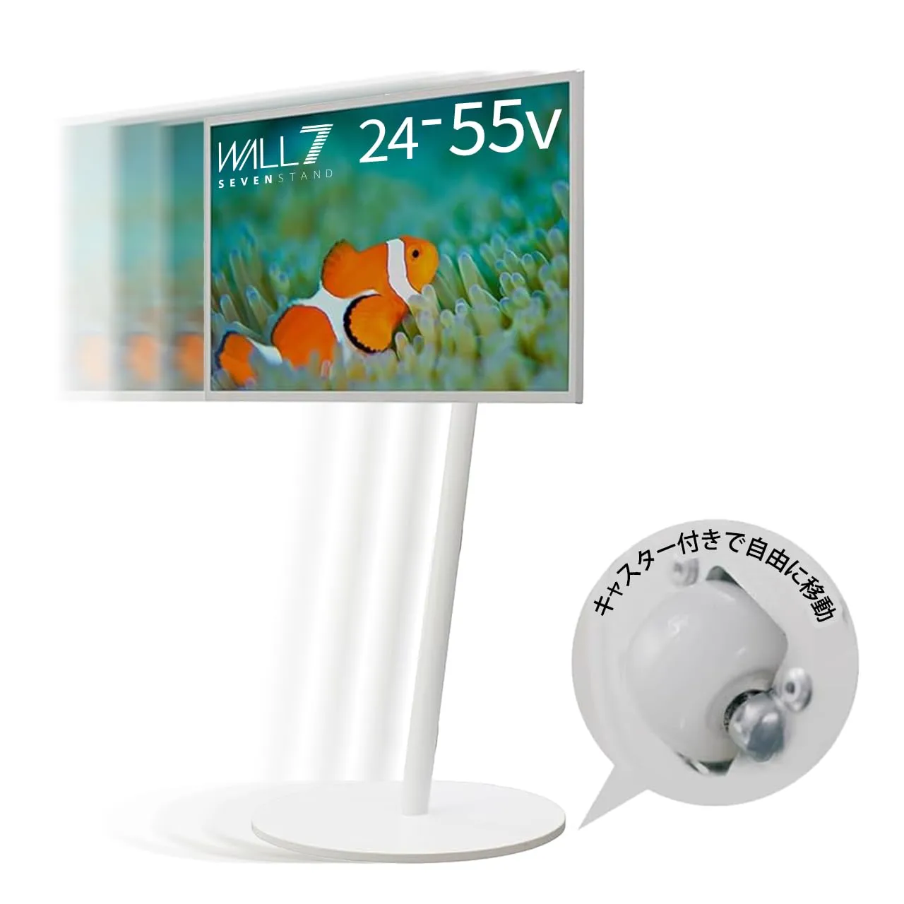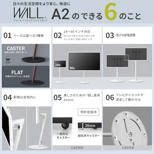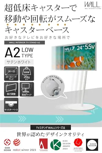 WALL 【デザイン賞4冠】 A2 CASTER BASE テレビスタンド 超低床 隠しキャスター付き 7の字フレーム ロータイプ サテンホワイト 耐震 震度7対応 高さ5段階調整 24~55インチ対応 白 ホワイト 可動式 移動式 自立 壁寄せ テレビ台 /