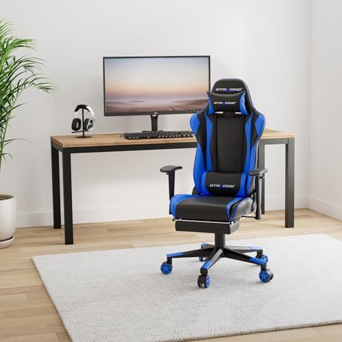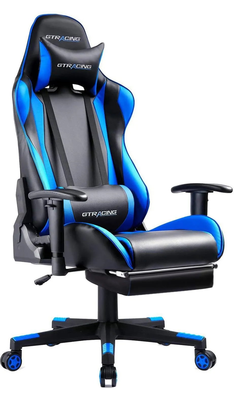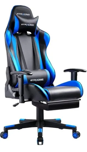 GTRacing ゲーミングチェア オフィスチェア デスクチェア ゲーム用チェア リクライニング パソコンチェア ハイバック ヘッドレスト ランバーサポート ひじ掛け付き 高さ調整機能 PUレザー オットマン付き ブルー (GT002F-BLUE)/