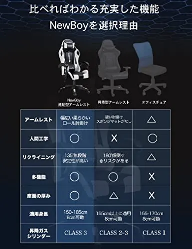 【長時間座っても疲れにくい】 NewBoyのゲーミングチェアはクッションが8cm厚さで丁度いい硬さあります。高密度な整形綿採用しており、体を安定させて激しいゲーミングの際にも安定感を保ち、お尻にかかる圧力を効果的に分散でき、より快適な座り心地を実現します。一日中座っても疲れにくいです。