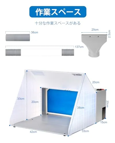 充分な作業スぺース:このスプレーブースの作業スペースサイズ:403434cm(幅奥行高さ)この広いスペースにより、作業中にゆとりを持って動くことができ、ストレスが軽減され、作業に集中できます。また、付属されている塗装用の回転プレートも使用する事ができ、塗装対象物を手で持たずに向きを変えて作業する事も可能です。手元が汚れにくく、作業効率もアップします!