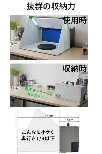 広々とした作業スペース:展開時の作業空間は幅41奥33高33cm。ブース内で両手を自由に動かせるため、大型モデルの塗装やエアブラシ、スプレー缶での作業もストレスなく行えます。ゆとりのあるサイズ感で、周囲への汚れを気にせず作業に没頭できます。
