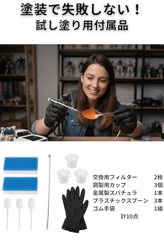 MORDIA限定付属品セット:予備フィルター2枚に加え、調色に便利なカップ3個、金属製スパチュラ1本、スプーン3本、ゴム手袋1組の計10点をセットでお届けします。届いたその日から本格的な塗装が始められる充実の内容です。これら便利な周辺道具がセットになっているのは、ユーザー目線を大切にするMORDIAだけの特典です。