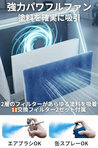 パラフルファン搭載:強力ファンによる安心の吸引力。風速4m/s・風量4m?/sのハイパワー仕様で、匂いの強い缶スプレーの塗装も快適です。本体装着済み予備2枚の計3枚のフィルターを同梱。缶スプレー利用時はフィルター中央に向けて吹き付けることで、吹き返しを抑え効率的に排気できます。長時間の作業でも空気をクリーンに保ち、制作に集中できる環境を提供します。