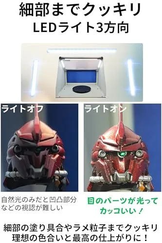 LEDライト3本搭載:上部と左右の計3箇所にLEDライトを配置。手元を明るく照らし、細部の塗りムラや色味をしっかり確認できます。夜間の作業でも視認性が高く、模型を理想通りの仕上がりに導きます。影ができにくい構造のため、緻密な塗装作業を強力にサポートします。