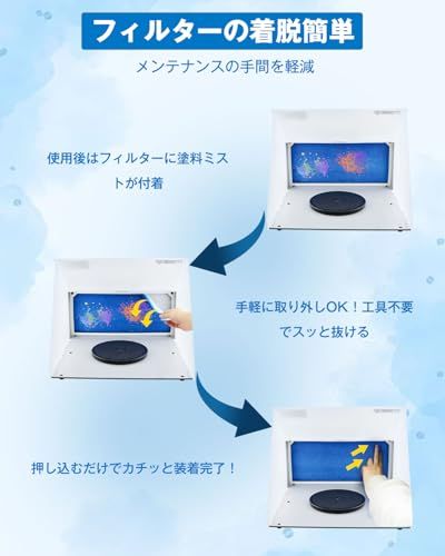 【ASPB-S】:人気モデル「ASPB-01塗装ブース」をベースに、必要な基本性能をしっかり備えたシンプルな構造が特徴の「ASPB-S」。使いやすさを追求した入門モデルで、ご自身でLEDライトを取り付けるDIYにも対応。操作性と実用性を兼ね備え、コストパフォーマンスに優れた一台です。 塗料ミストをしっかり吸引:本スプレーブースは、風量4m?/min・風速4m/sのプロペラファンを搭載し、塗装時に発生するミストや臭いをしっかり吸い込みます。付属のフィルターは2層構造で、フィルター効果が高く交換も簡単。塗装中の空気をクリーンに保ち、快適な作業環境をサポートします。 延長用ダクトホース付きで設置も安心:排気ホースは延長用ダクトホースに対応しており、窓までの距離がある場合でも柔軟に対応可能。設置場所の自由度が高く、室内でも安心して使用できます。換気環境が整っていない場所でも心配ありません。 作業効率を高める回転プレート&ゆとりある作業スペース:ASPB-Sペインティングブースは、作業スペースサイズ約41.737.833.5cmの広さがあり、塗装中もゆとりを持って作業が可能です。さらに、塗装対象物の向きをスムーズに変えられる便利な回転プレートを付属。対象物を手で持つ必要がないため、手元が汚れにくく、プラモデルやホビーの繊細な塗装にも最適です。 収納も持ち運びも簡単:折りたたみ時のサイズは約41.714.820.4cm。直方体に畳めるため、省スペースでの収納が可能です。収納時にも場所を取らず、取っ手付きで持ち運びもラクラク。使いたい時だけサッと広げて、作業がすぐに始められます。