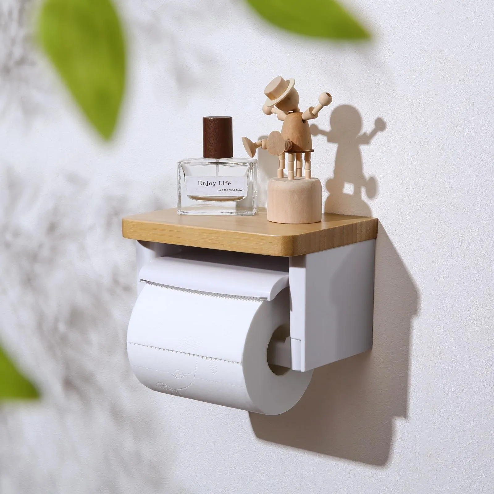 トイレットペーパーホルダー バスルーム ABSプラスチック楠竹木製製 切断機能付き DIY おしゃれ 2連 棚付き 賃貸対応 小物置き 簡単設置 補充楽 飾り棚 紙巻器 コンパクト設計 (竹ホワイト, シングル)