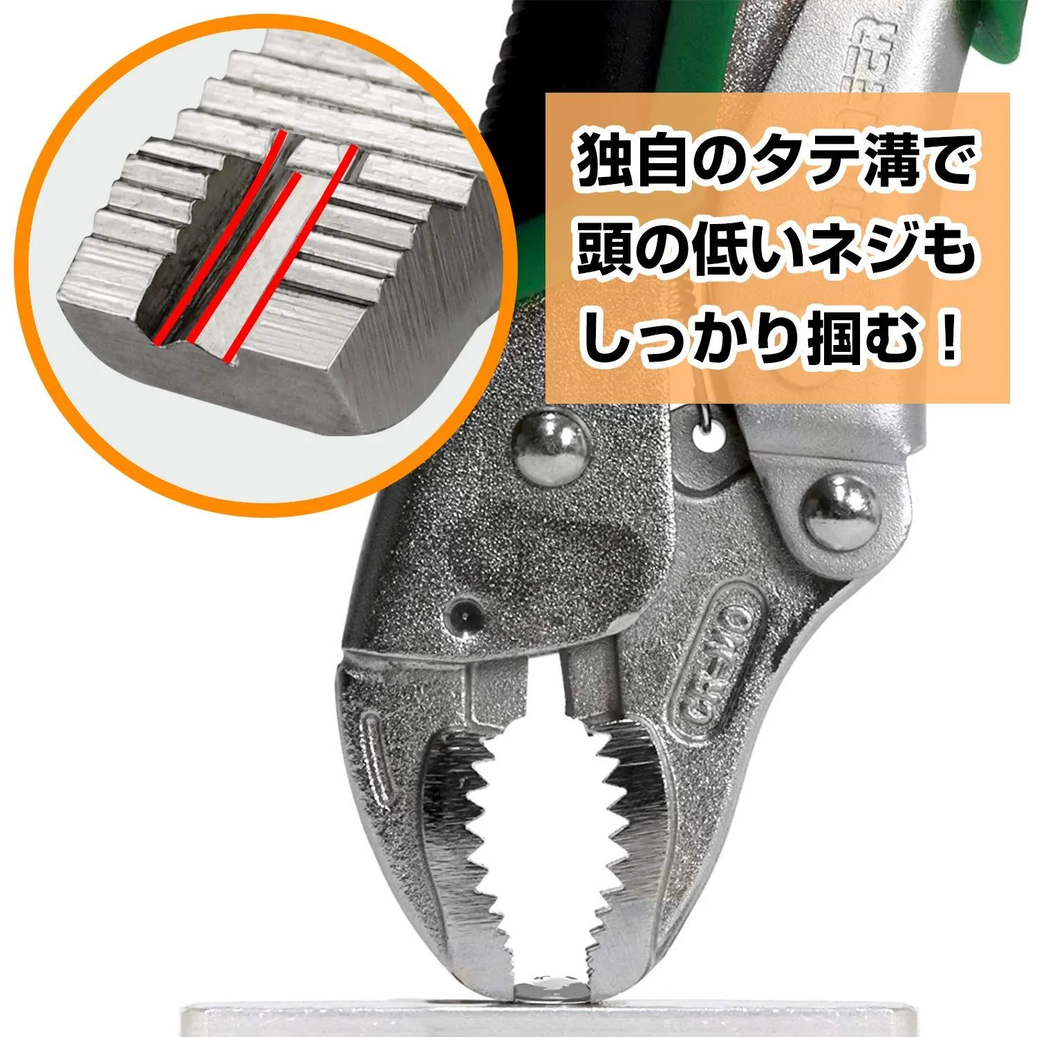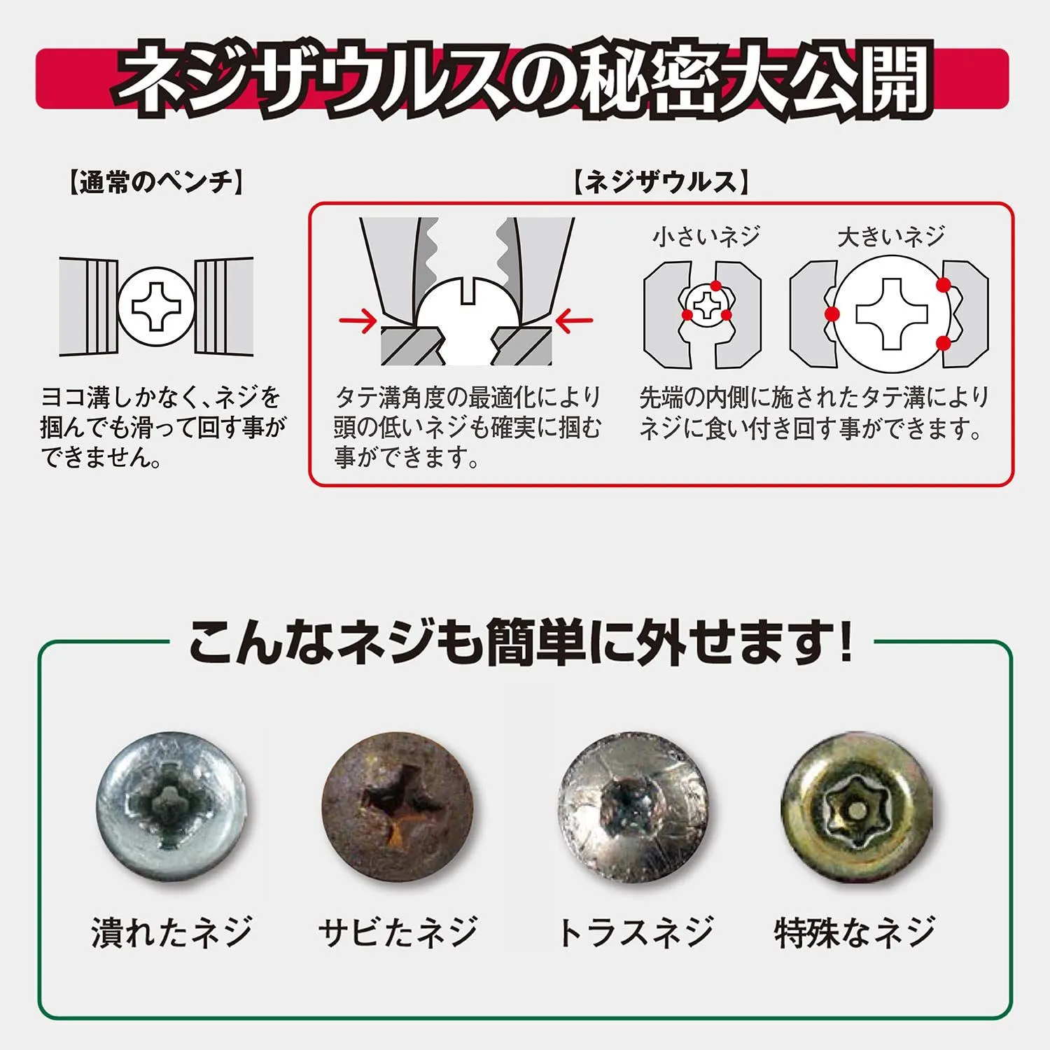 【特徴】 潰れたネジ、錆びたネジを先端のタテ溝で掴んで回せます。 独自の先端形状により、頭の低いネジ(トラスネジ)にも対応。 バイス機構がネジを掴んでロックするため、固く締まったネジでも、少ない力で回せます。 レバー操作なく簡単、安全に解除できるイージーリリース機構を採用。 口開き幅を調節する事でさまざまなワークの固定に使用できます。 刃部を搭載しており、針金などの切断ができます。 ※タッピングネジ、ドリリングネジ、コーススレッドなどの硬度が高いネジや、接着剤や錆で完全に固着したネジには使用しないでください。