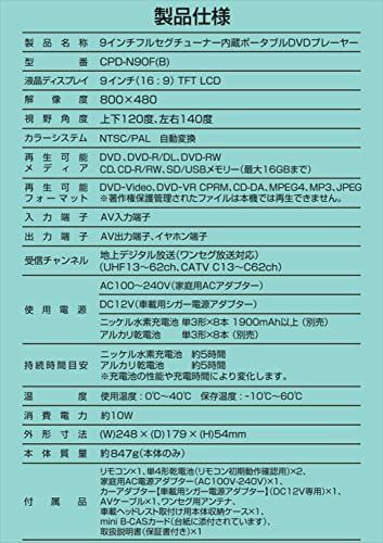 [山善] ポータブル DVDプレーヤー CPRM対応 9インチ フルセグチューナー内蔵 3WAY電源 AC/DC/乾電池 5時間連続再生 車載用バッグ付き 軽量 リモコン付き CPD-N90F(B)【送料無料】【☆Yuki☆Shop】