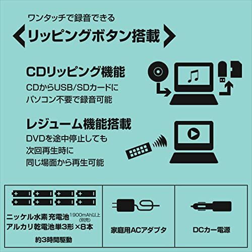【便利な機能】CDからUSB/SDカードにパソコン不要でワンタッチ録音ができるCDリッピング機能搭載。また、DVDを途中停止しても次回再生時に同じ場面から再生が可能なレジューム機能も搭載しております。