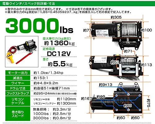 【商品仕様】巻き上げ重量:3000LBS(1360kg) / 定格電圧:DC12V / ギア比:153:1 / モーター:永久磁石 1.0kw/1.34hp / その他:防水仕様