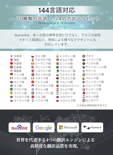 Wooask W12 写真翻訳機能付の音声翻訳機です。翻訳言語は144言語(70アクセントを含む)を双方向リアルタイムに翻訳できます。Wooask翻訳機は世界の70か所に翻訳サーバーを配置。世界のどこでも使える0.5翻訳の速度と安定性を提供します。(翻訳速度:最大0.5-3.0秒)
