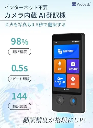 Wooask W12 翻訳機 音声翻訳機 ウーアスク【SIM不要/追加料金不要/オフライン翻訳対応】画面 携帯翻訳機 144言語対応 0.5秒翻訳 写真翻訳 オフライン対応 タッチスクリーン/